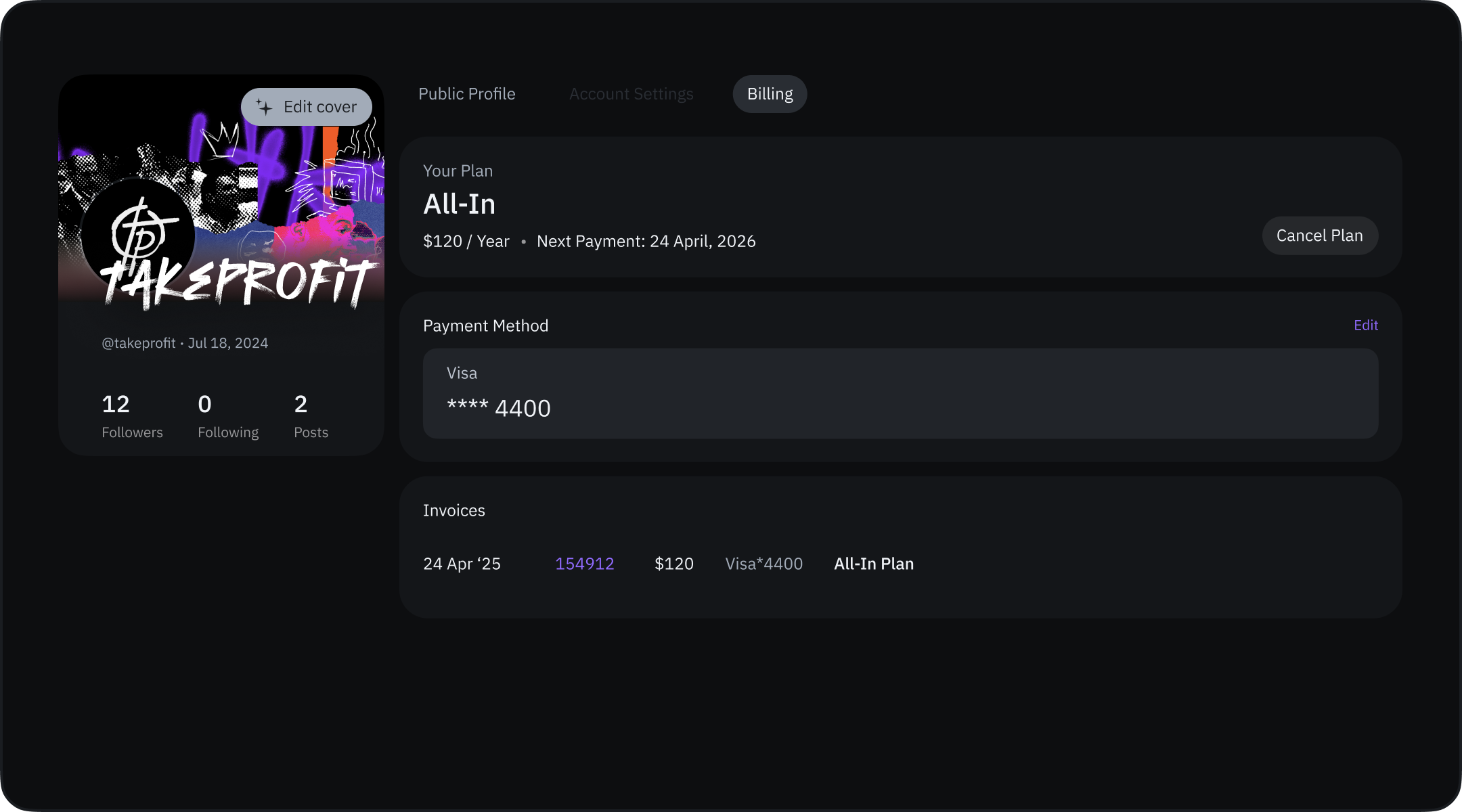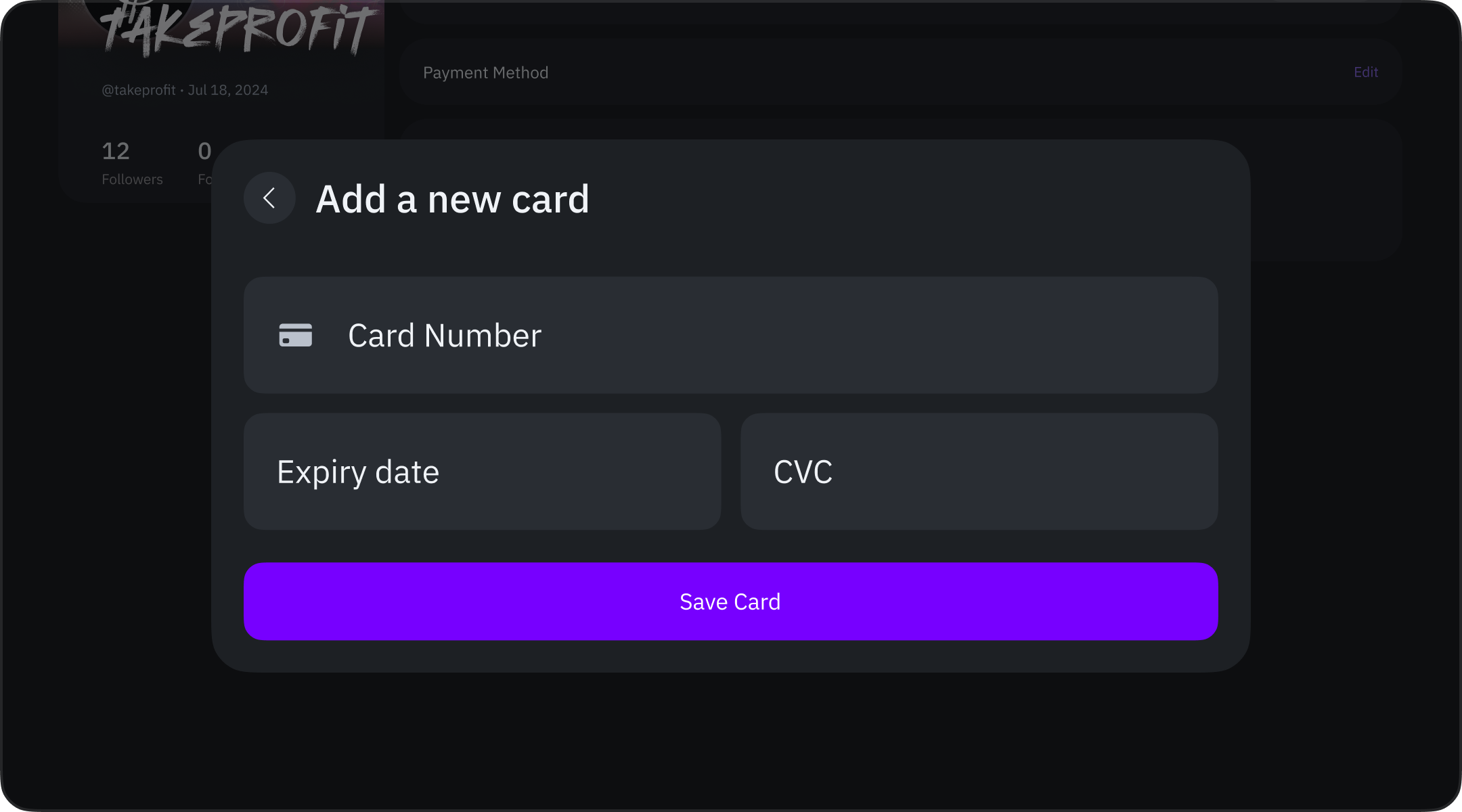 - All payments are processed through the Stripe platform. TakeProfit does not store or process your payment information