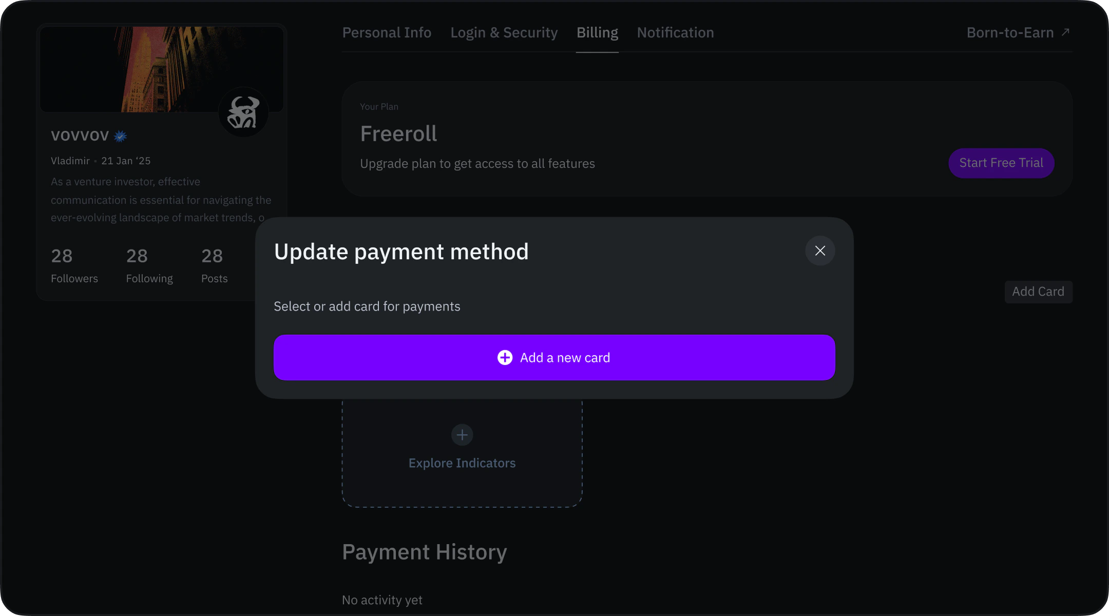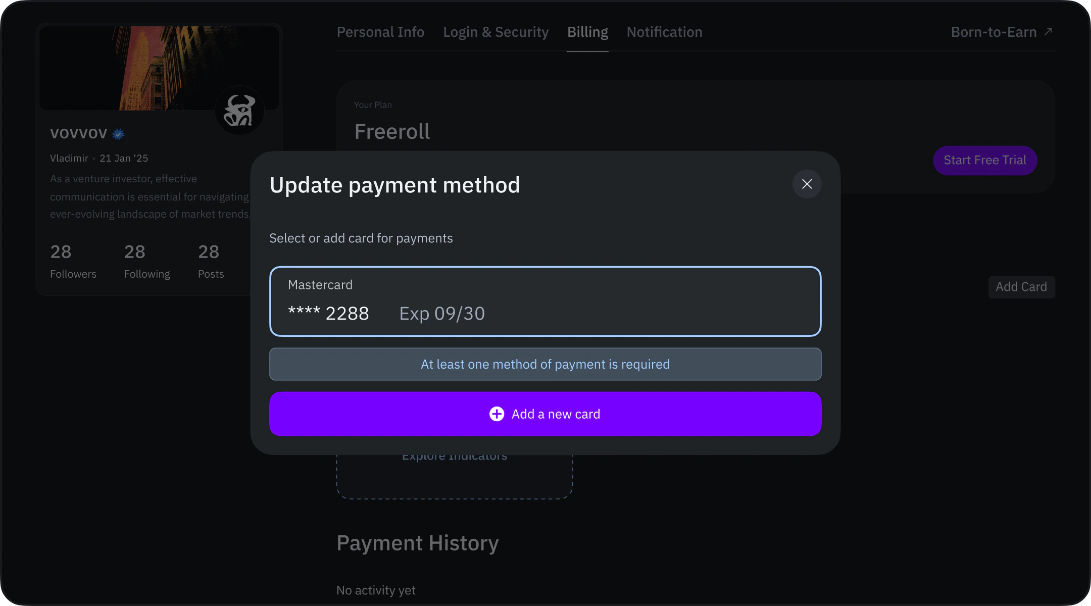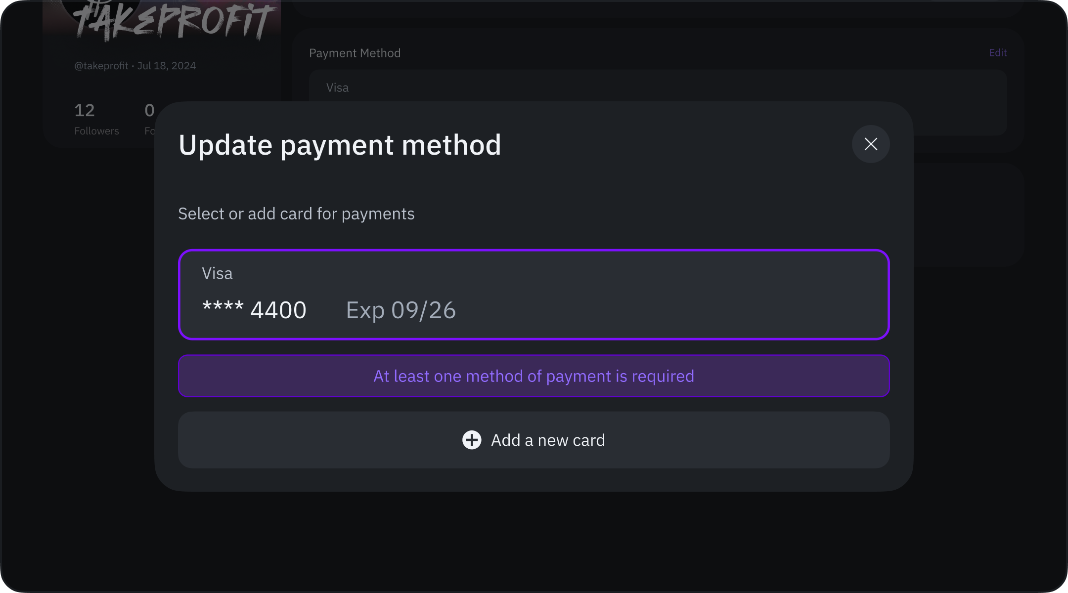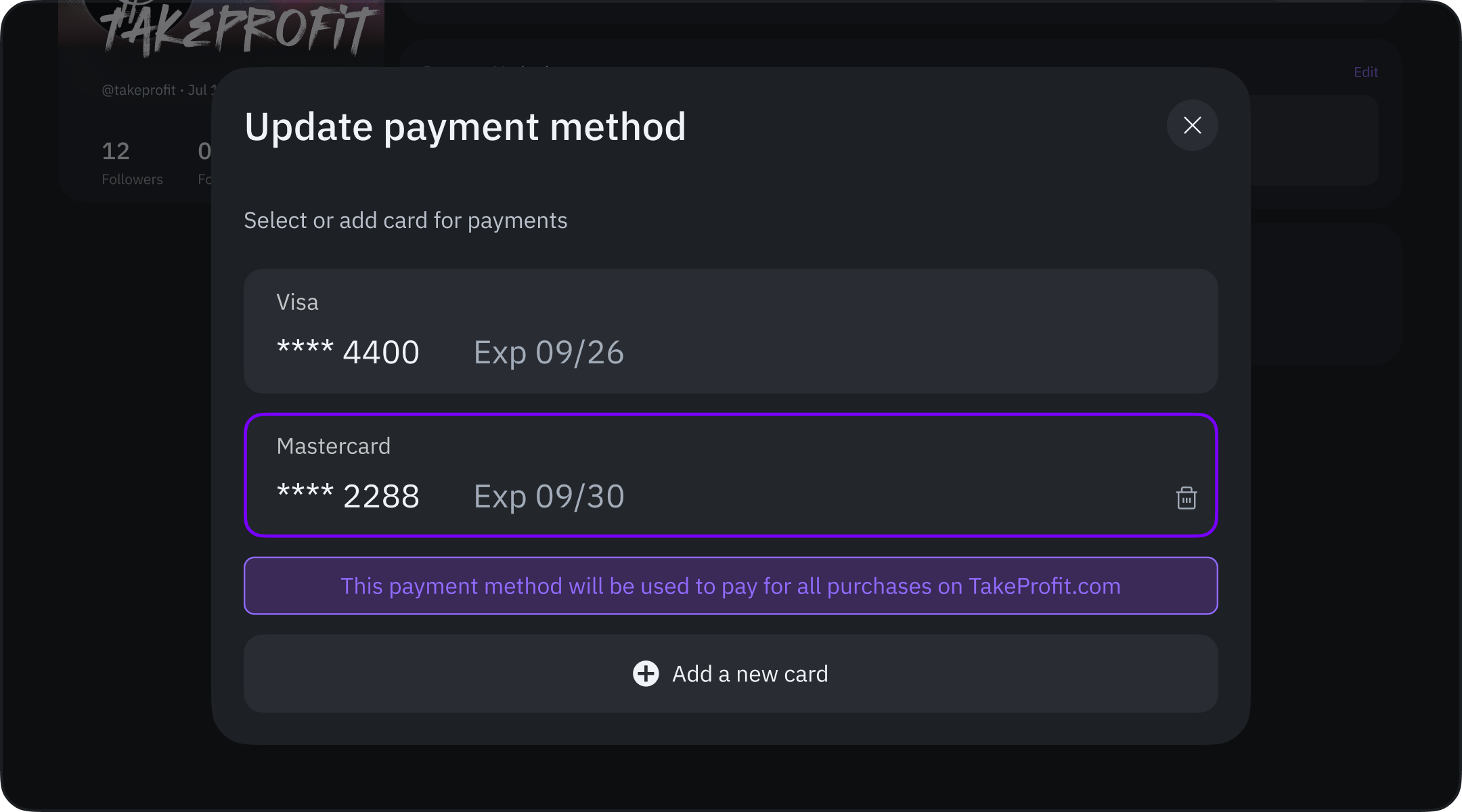 - View the default payment notice: “This payment method will be used to pay for all purchases on TakeProfit.com”.