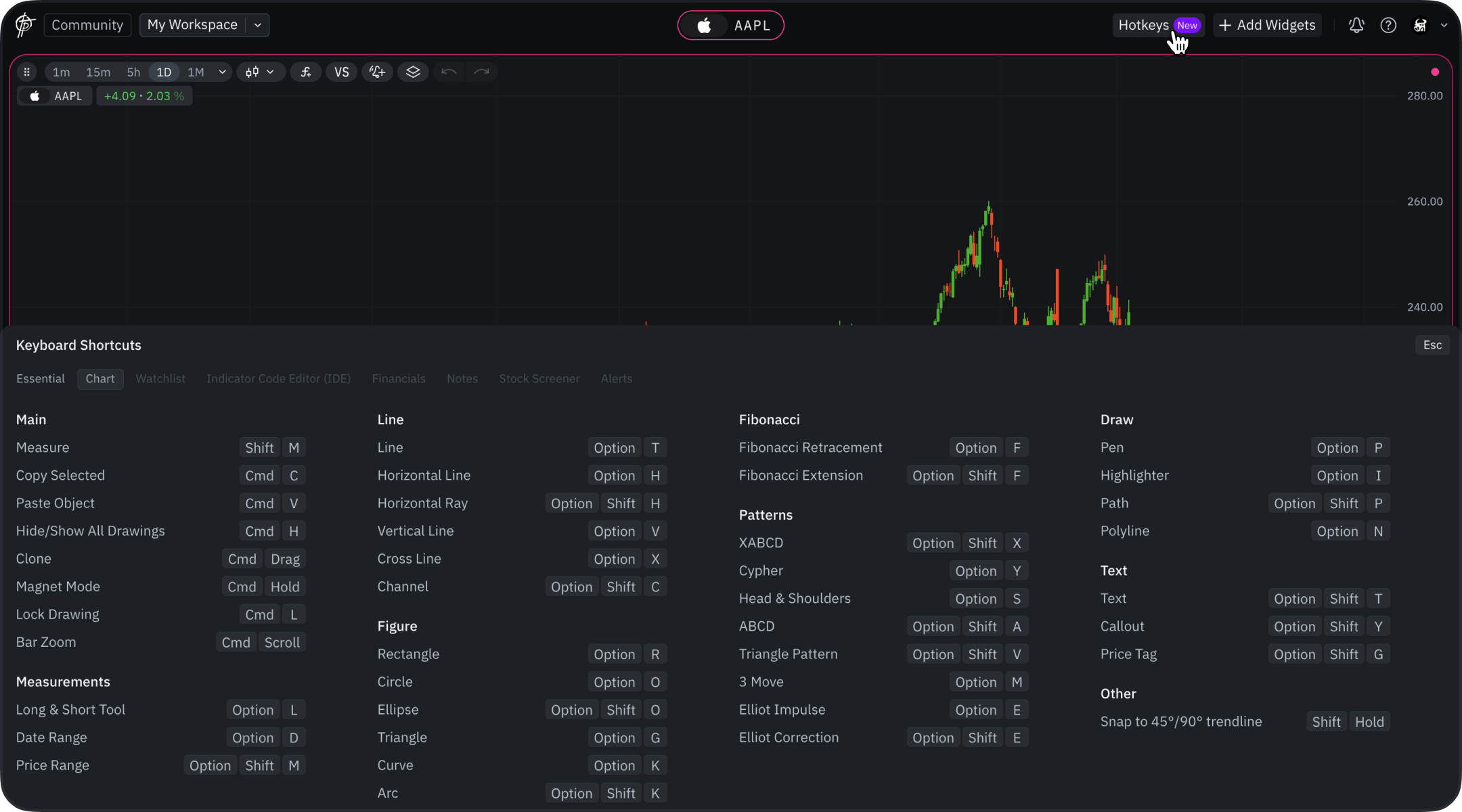 Switch between active widgets | Tab | Cycles focus between main work areas (Chart, Financials, Notes, etc.) |