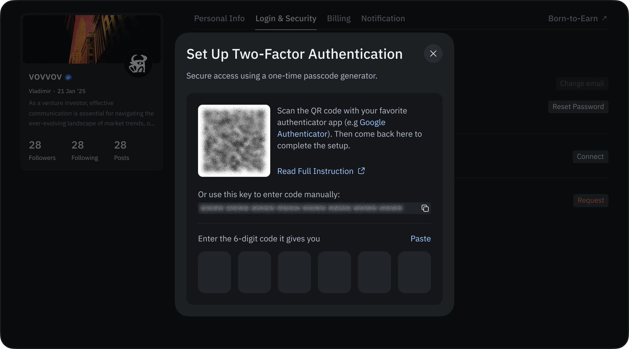 In the Two-Factor Authentication section, select Setup 2FA.2. Scan the QR code or use the manual key