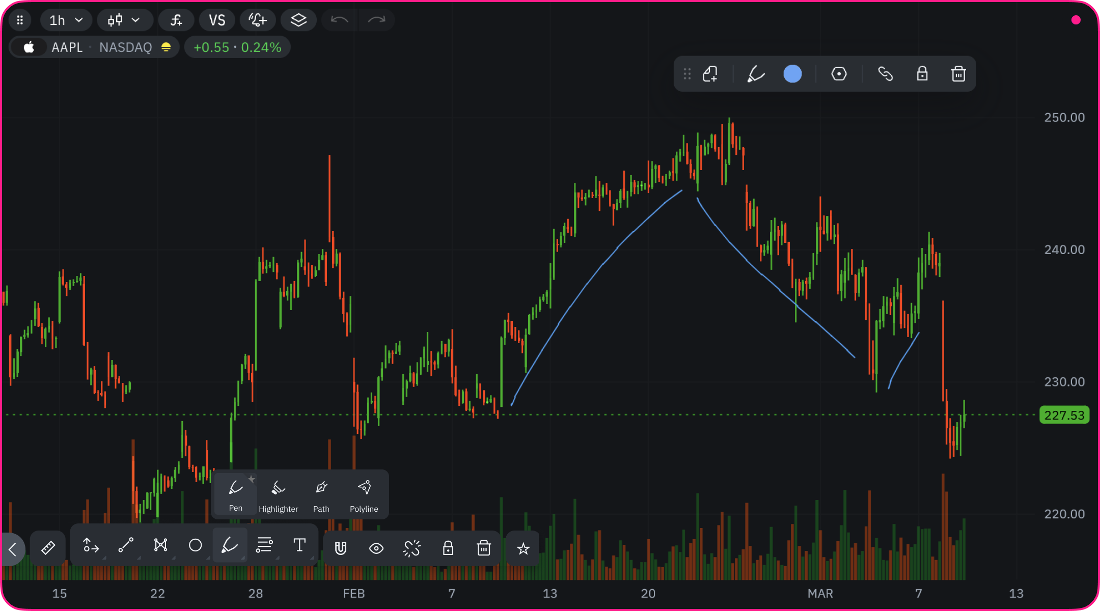 The Pen tool allows for completely freeform drawing on your chart, similar to drawing with a pen on paper. It creates a continuous line that follows your mouse movement exactly.How to Use