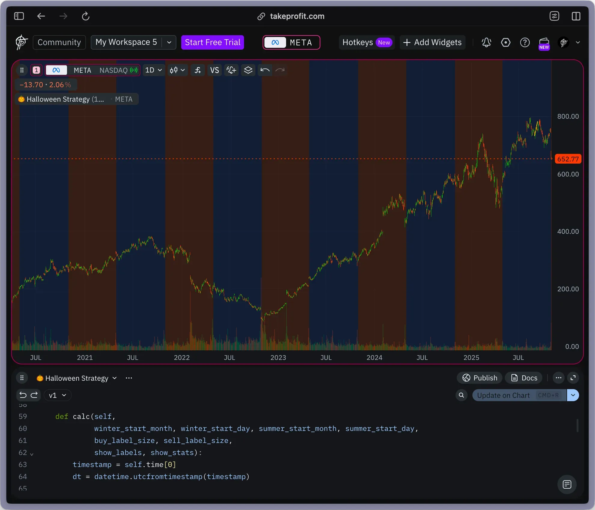 @indicator('🎃 Halloween Strategy', overlay_main_pane=True)@param.int('winter_start_month', default=10, min=1, max=12, title='Winter Period - Start Month')@param.int('winter_start_day', default=31, min=1, max=31, title='Winter Period - Start Day')@param.int('summer_start_month', default=5, min=1, max=12, title='Summer Period - Start Month')@param.int('summer_start_day', default=1, min=1, max=31, title='Summer Period - Start Day')@param.float('initial_equity', default=100.0, min=1.0, max=1000000.0, title='Initial Equity (%)')...class Main(MainContext):def __init__(self, initial_equity):# Now all parameters are customizable!...self._initial_equity = initial_equity...def calc(self, winter_start_month, winter_start_day, summer_start_month, summer_start_day):...if month < summer_start_month:...