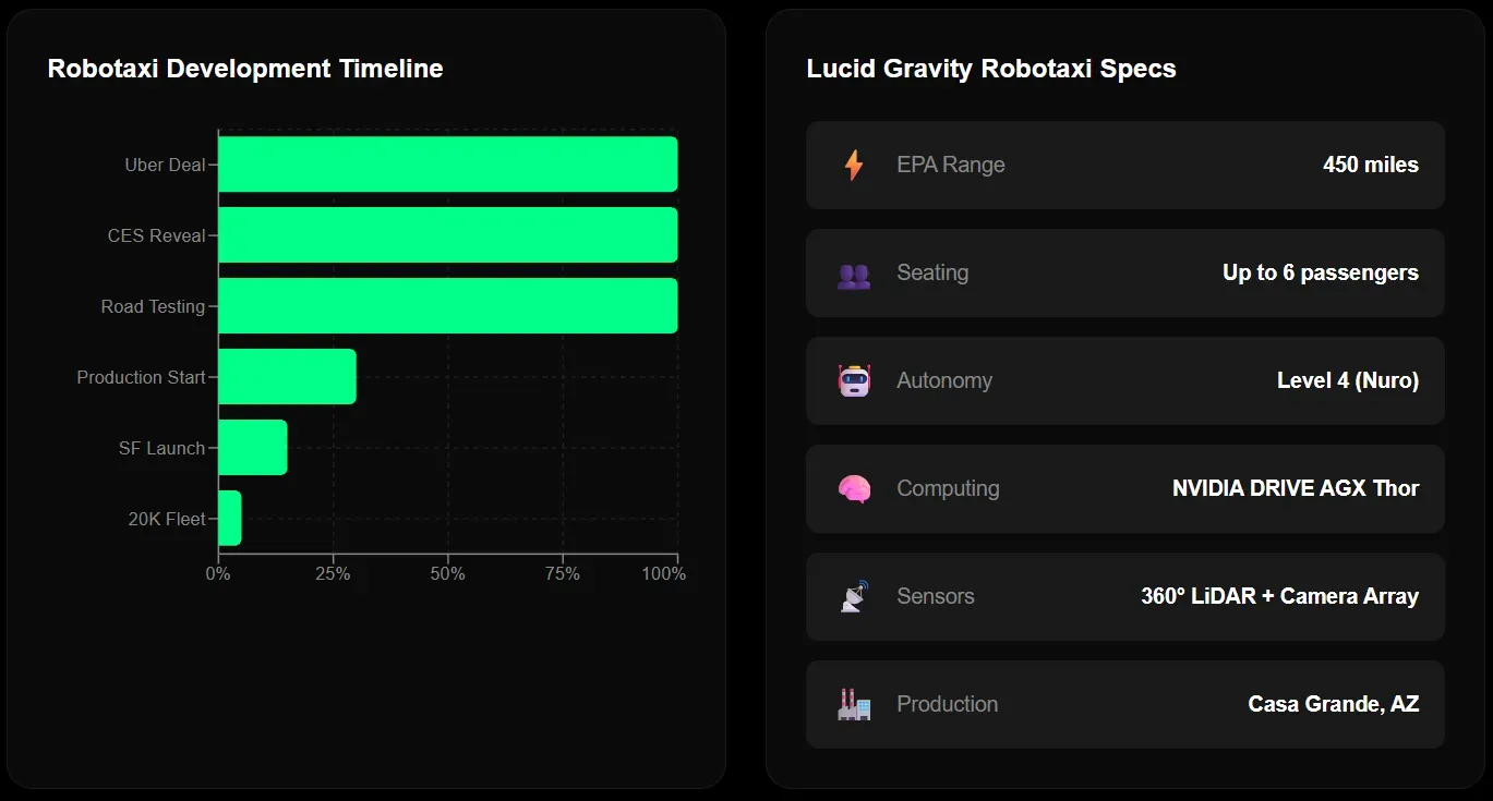 The real story here isn't just the Saudi factory. At CES 2026, Lucid, Nuro, and Uber unveiled their production-intent robotaxi based on the Gravity SUV. Autonomous on-road testing already began in December in the San Francisco Bay Area, with commercial launch expected later this year.