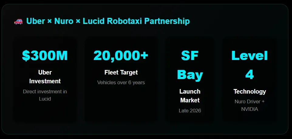 The numbers are significant: Uber plans to deploy 20,000+ Lucid robotaxis over six years across dozens of global markets. Uber invested $300 million directly into Lucid, with multi-hundred-million dollar commitments to both Lucid and Nuro. This isn't just a partnership - it's a strategic bet on Lucid's technology being the backbone of autonomous ride-hailing.