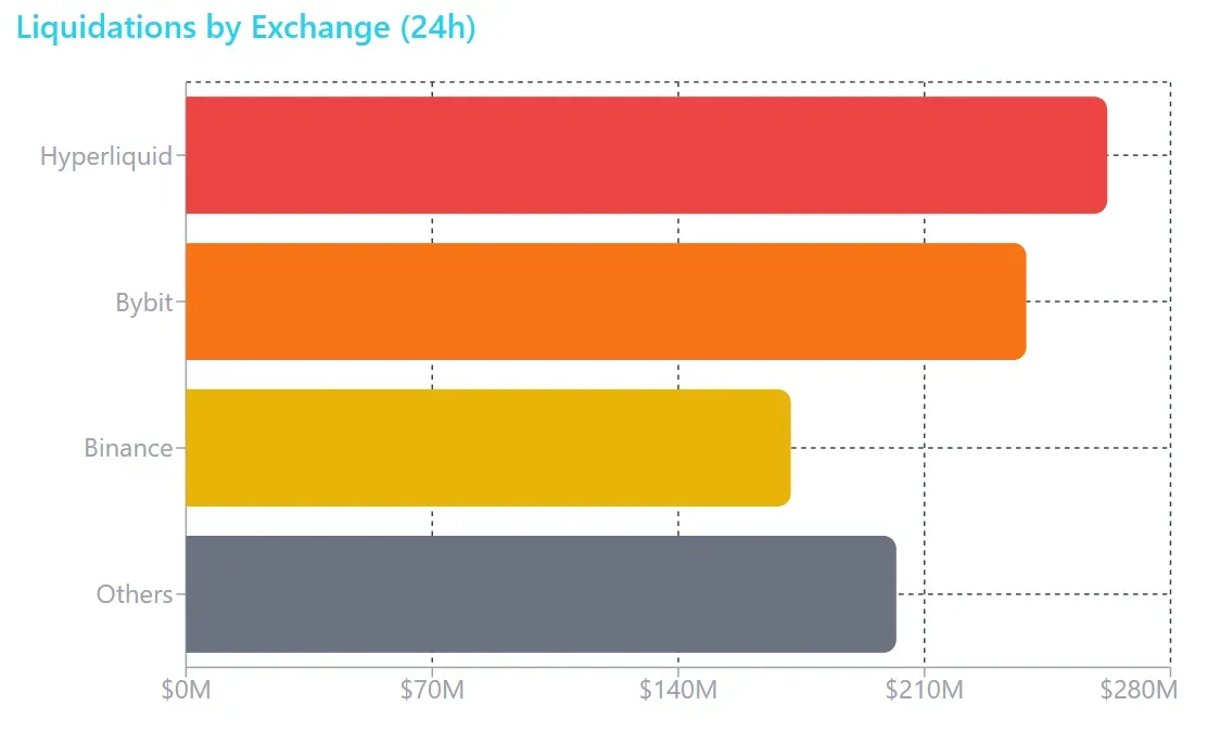 The market reacted instantly. With thin holiday liquidity (US exchanges were closed for the weekend), the liquidation cascade cut through crypto derivatives like a hot knife through butter. Hyperliquid led with $262 million in liquidations, followed by Bybit at $239 million and Binance at $172 million.