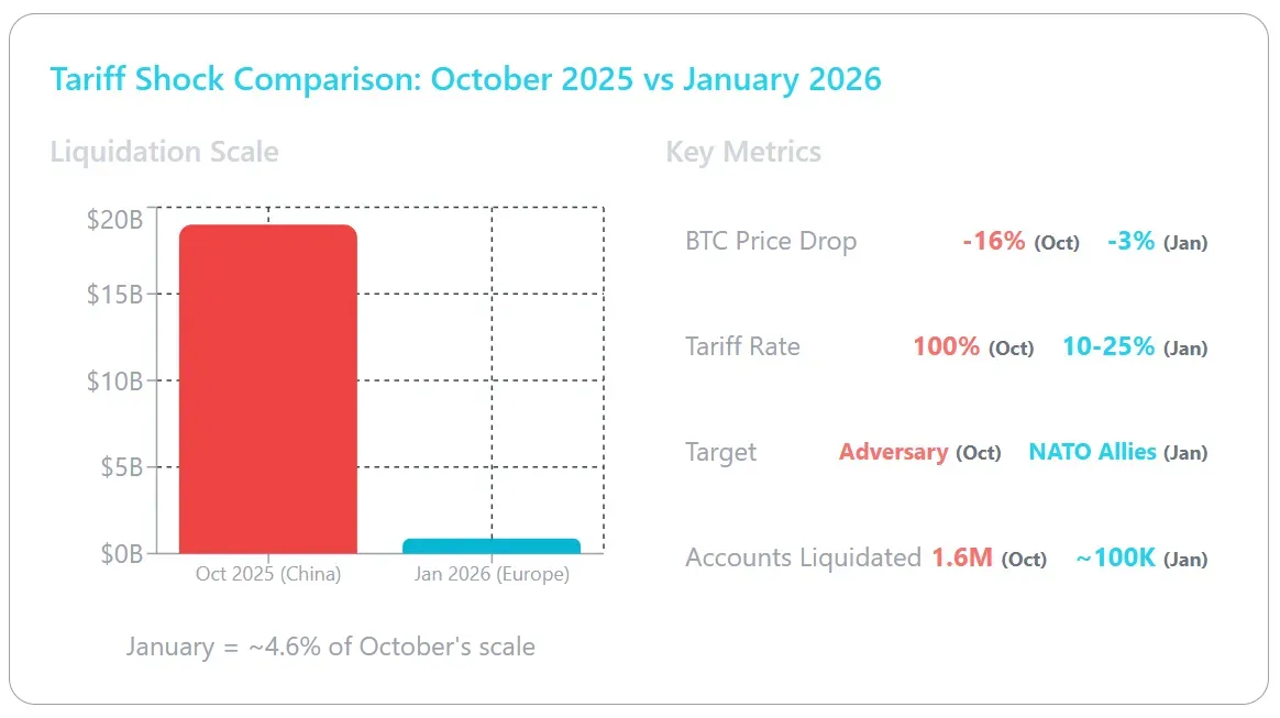 The current drop is roughly 4-5% of October's scale in terms of liquidations. But here's the important nuance: back then, BTC recovered above $114,000 within just a few days. The market showed resilience. October targeted a geopolitical adversary with 100% tariffs. January targets NATO allies with 10-25% tariffs. The stakes and the market reaction are calibrated accordingly.
