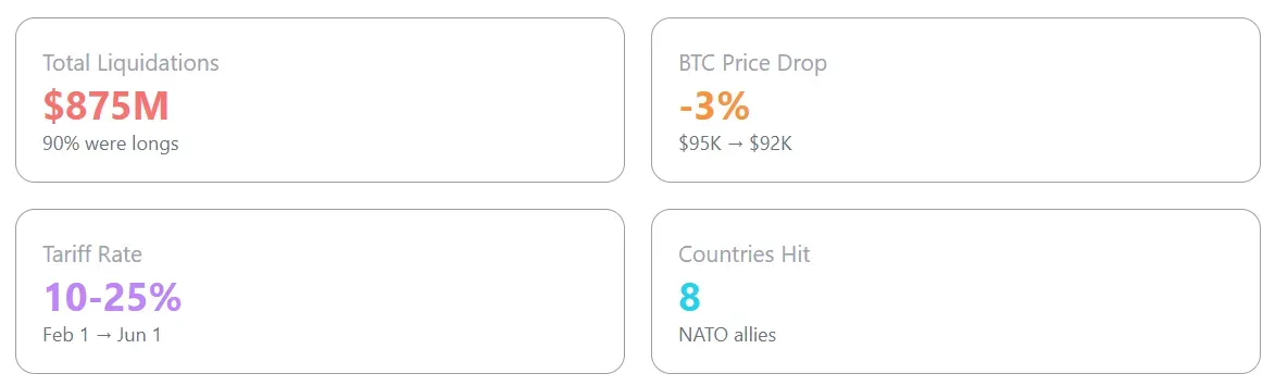 The weekend brought another Trump surprise, and the crypto market found itself at the epicenter of geopolitical turbulence once again. On Saturday, the President announced 10% tariffs on imports from eight European countries starting February 1, escalating to 25% by June - all because they won't sell Greenland. Within 24 hours, this triggered $875 million in liquidations and sent Bitcoin crashing from $95,000 to $92,000.