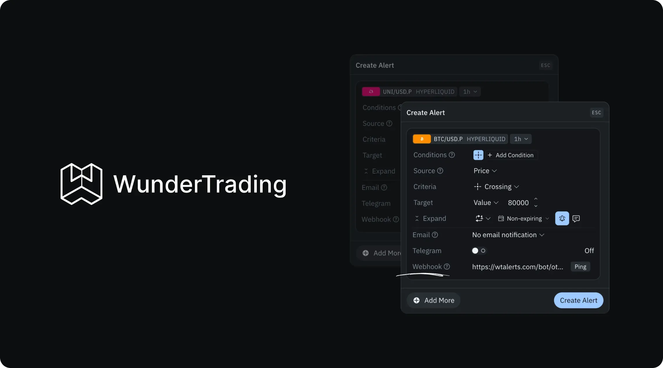 Alert-based automation is now available through integration with WunderTrading. You can route TakeProfit alerts to WunderTrading using webhooks and automate trading workflows end-to-end — from signal generation to order execution.