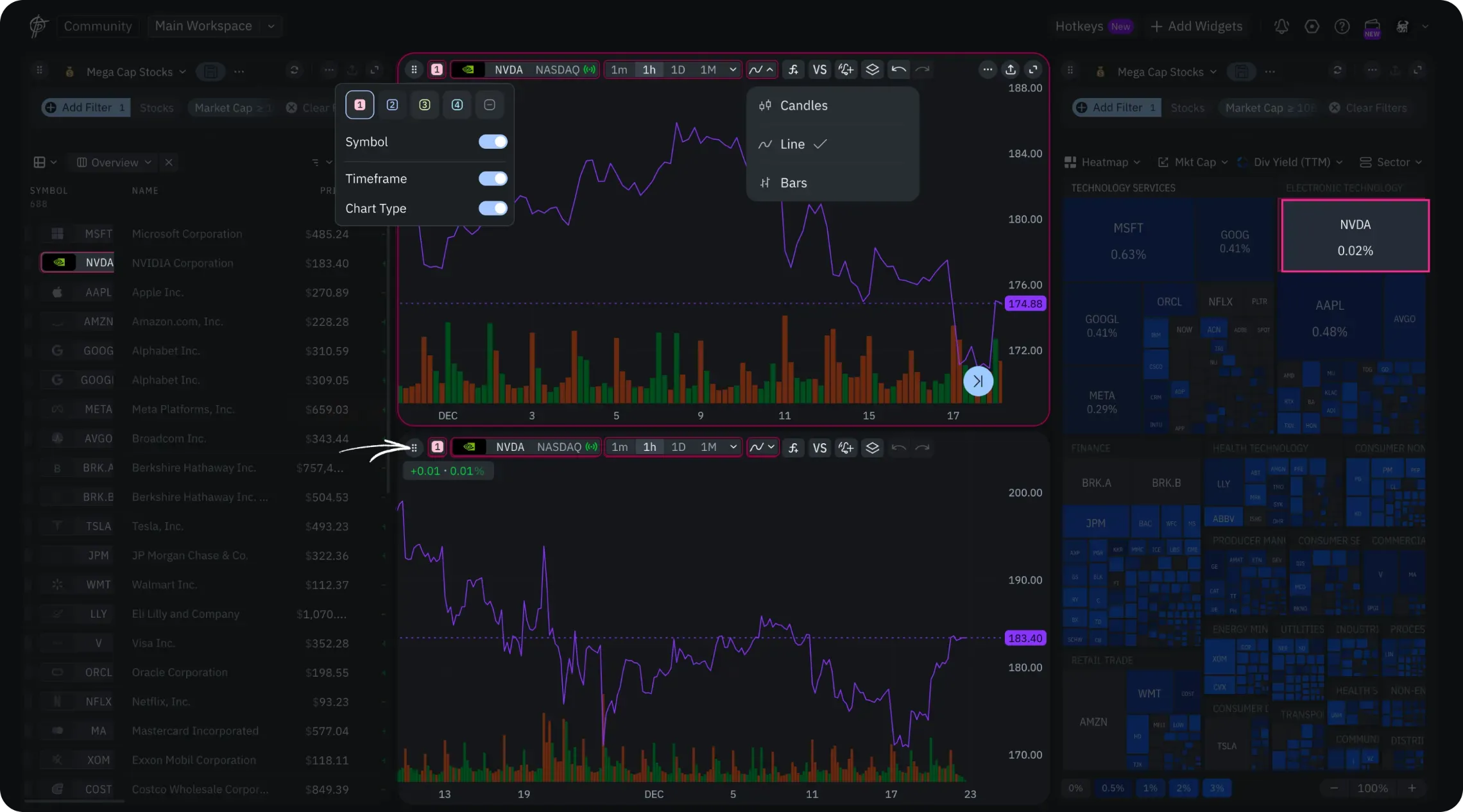 Widget Linking has been extended to synchronize symbols, chart types, and timeframes across linked widgets. This allows you to maintain consistent context when working with multiple charts in parallel.