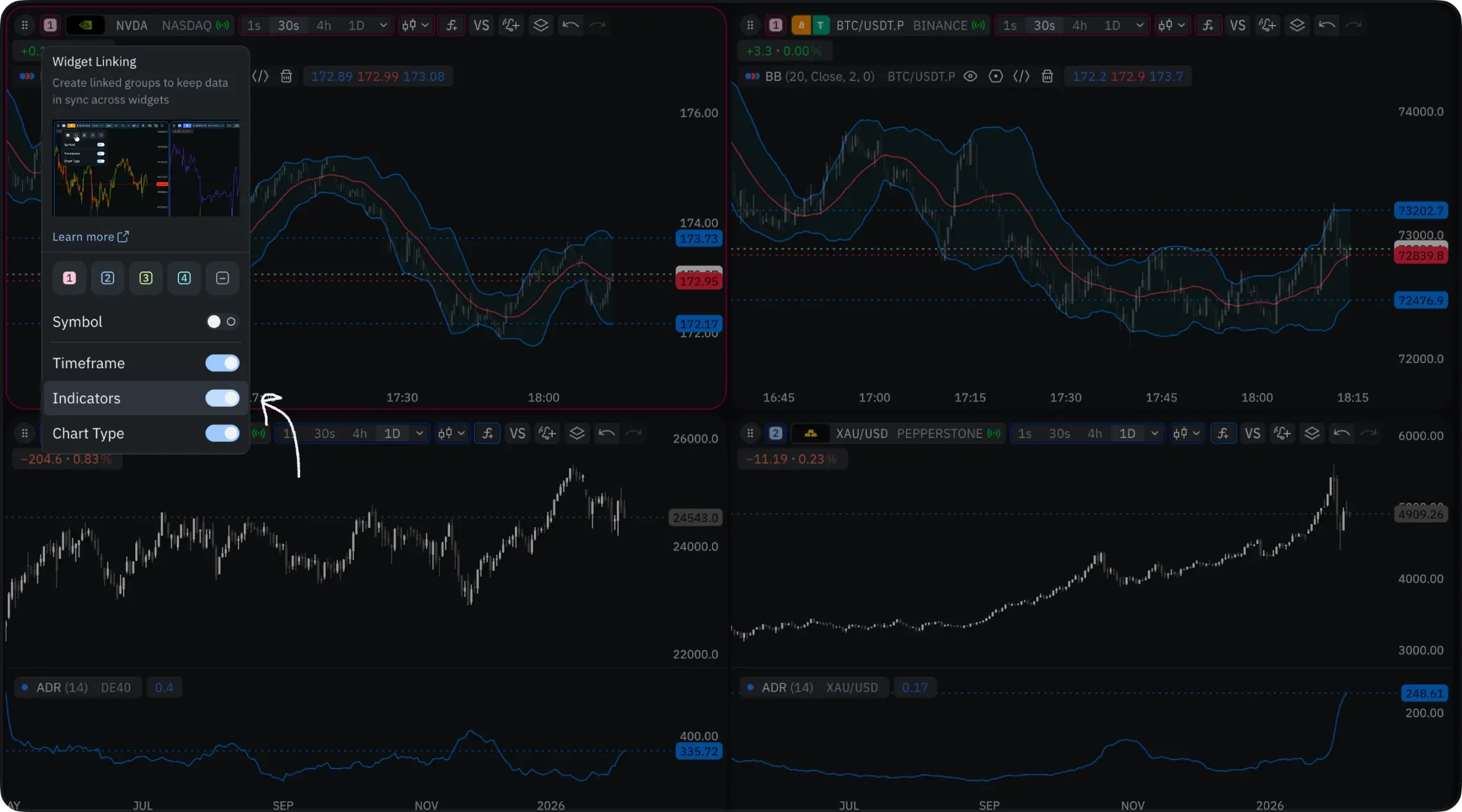 Widget linking now supports indicator synchronization as a separate toggle, independent from symbols and timeframes.